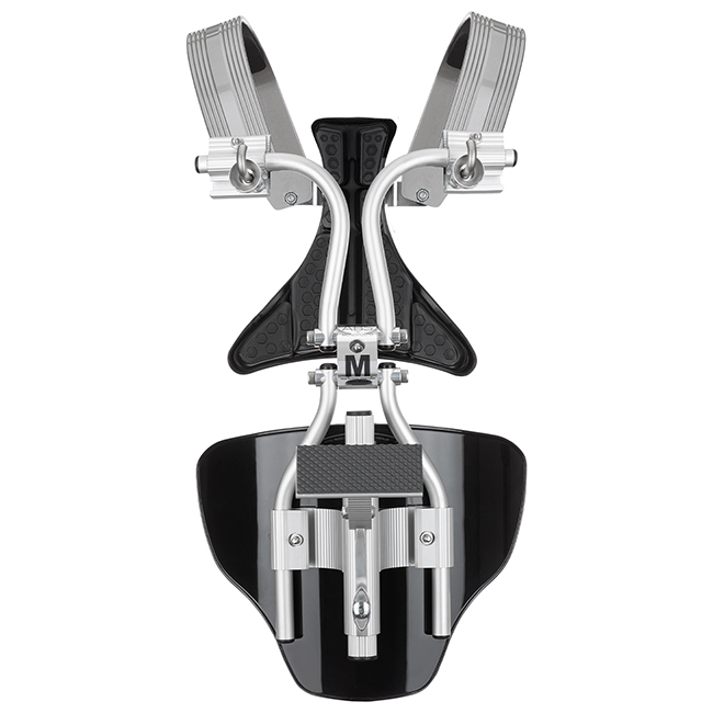 Patented Contour Hinge technology incorporates two specifically designed pivot points that independently adjust, profiling both the upper and lower body of the player, supporting a 1:1 real-time extension of the performer’s elaborate maneuvers that are essential to contemporary band performances.