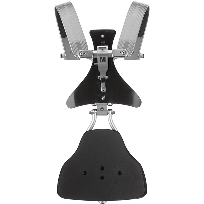 Patented Contour Hinge technology incorporates two specifically designed pivot points that independently adjust, profiling both the upper and lower body of the player, supporting a 1:1 real-time extension of the performer’s elaborate maneuvers that are essential to contemporary band performances.
